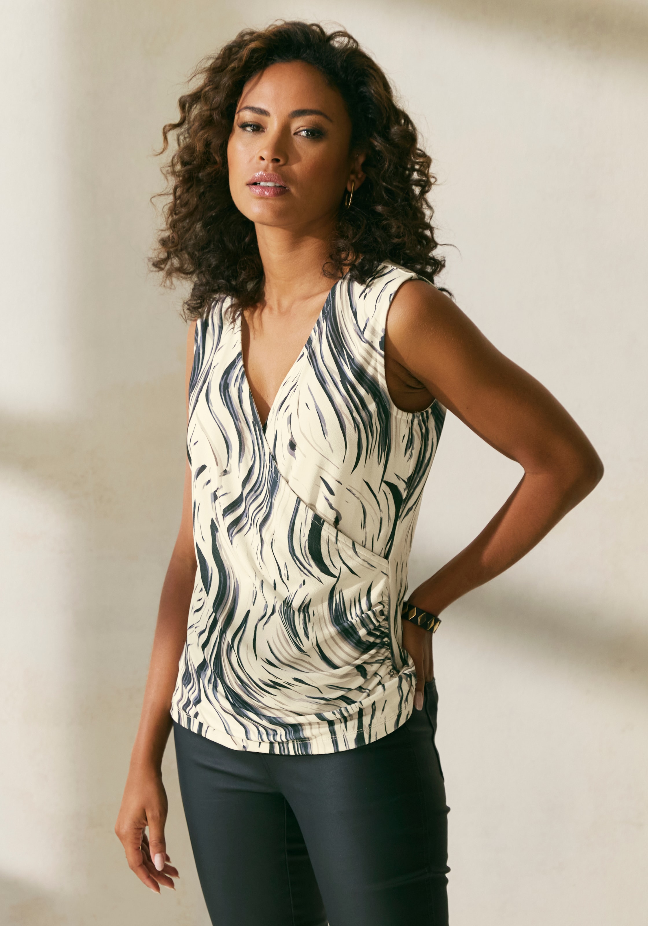 Allover gemustertes Top von Lascana. Individueller Print, dadurch ist jedes Teil ein Unikat. Cache-coeur-Ausschnitt, seitliche Raffung und breite Träger. Elastische Qualität.
