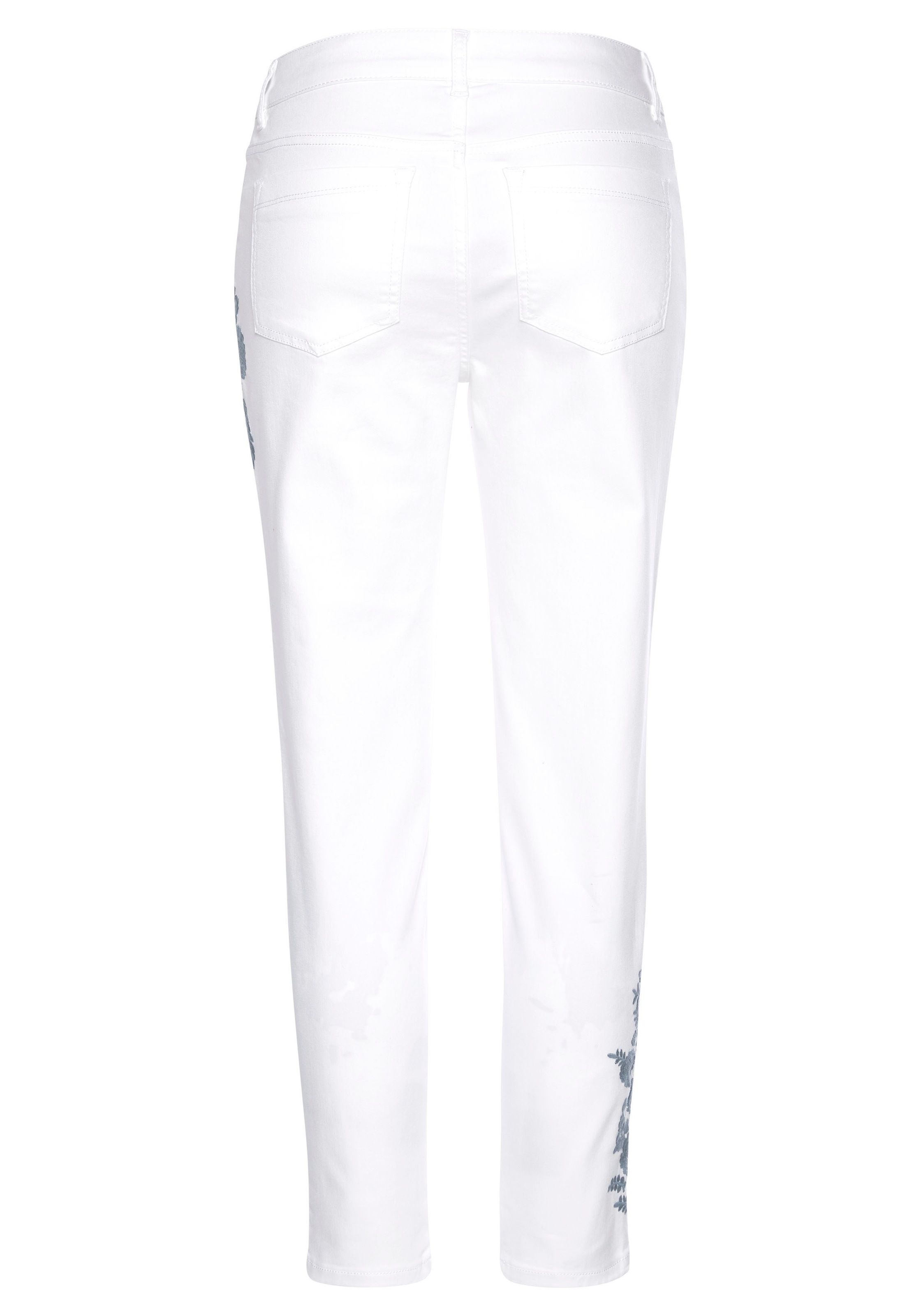 Mit Stickerei oben auf einem Bein und unten auf dem anderen. Im Five-Pocket-Style mit Ziertaschendetails. Innenbeinlänge ca. XX cm. Aus 70% Baumwolle (unterstützt Cotton made in Africa), 27% Polyester, 3% Elasthan.