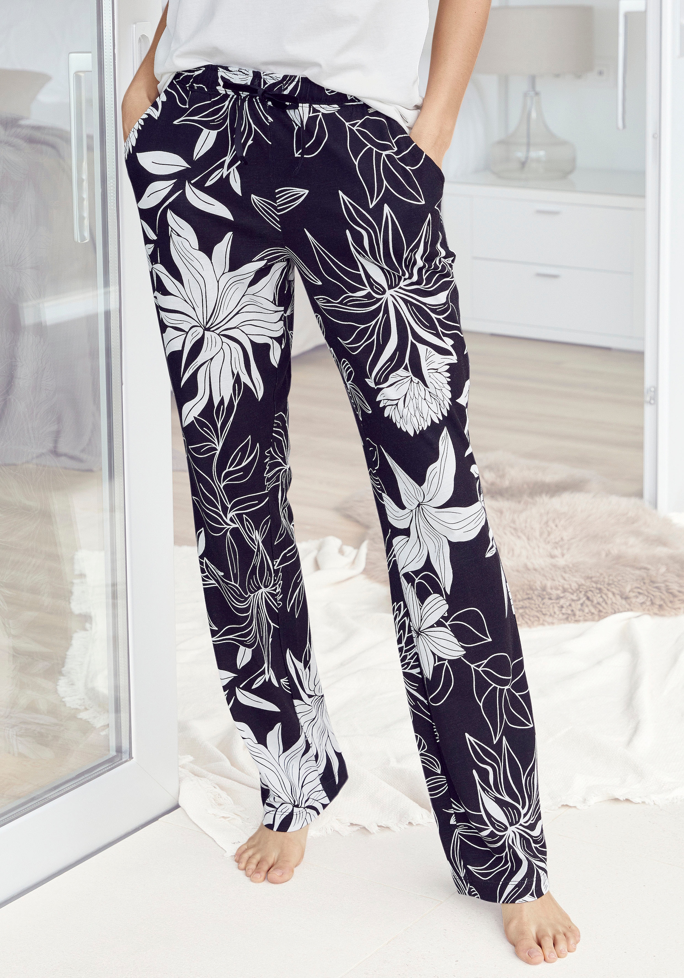 Stoffhose von Lascana. Mit floralem Alloverprint. Ausgestelltes Bein. Hoher, elastischer Tunnelzugbund. Seitliche Eingrifftaschen. Weiche Single-Jersey-Qualität aus 50% Baumwolle, 50% Viskose.