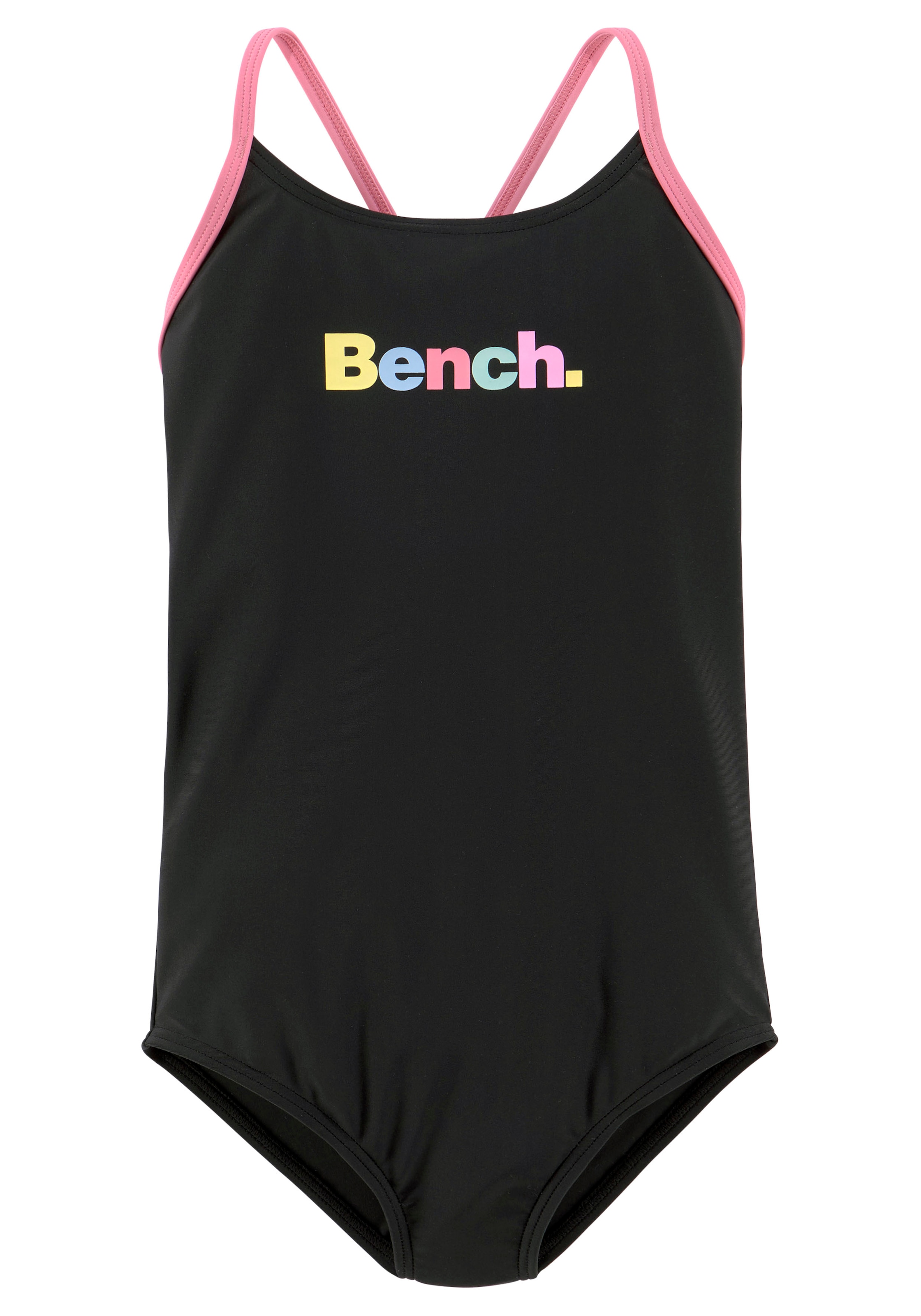 Modischer Badeanzug von Bench mit grossem bunten Markenlogo vorn. Tiefer runder Rückenausschnitt. Verstellbare kontrastfarbene Träger, hinten gekreuzt. Weiche Microfaser auas recyceltem Polyamid.