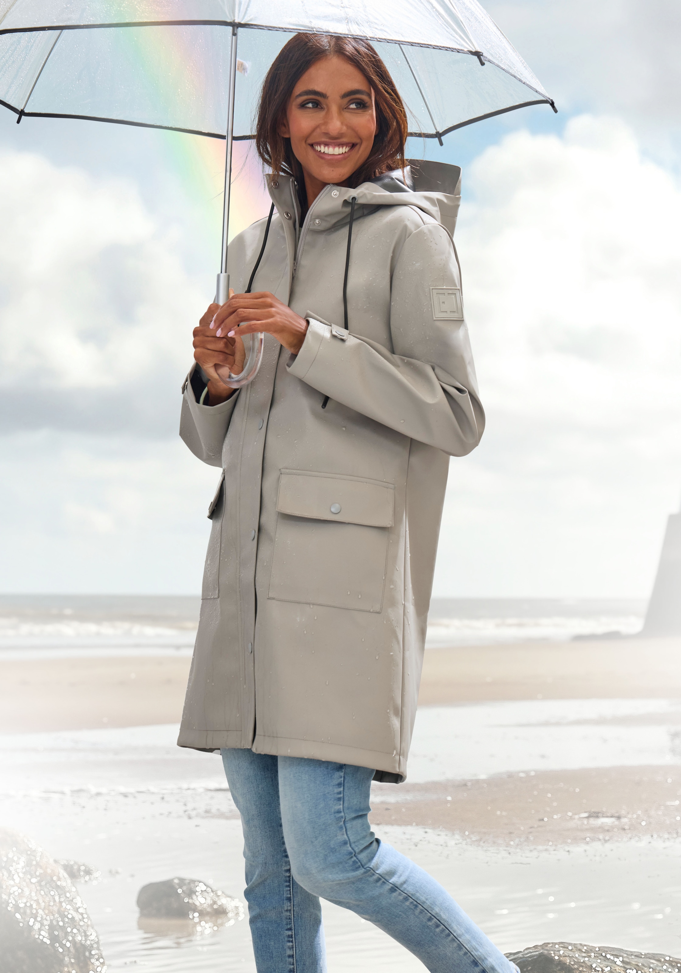 Lange Regenjacke von Elbsand. Kapuze mit Kordelzug. 2-Wege-Reissverschluss, verdeckt mit einer Druckkopfleiste. Saumschlitz hinten. Ärmel mit verstellbaren Riemen. Logoprints auf der Kapuze und dem linken Arm. Klappentaschen seitlich, Brusttasche mit Reissverschluss. Funktionale Qualität.