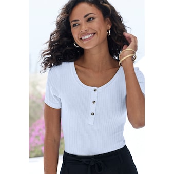 Cooles T-Shirt von Lascana aus Lederimitat. Rundhalsausschnitt. Überschnittene, verkürzte Ärmel. Figurbetonte Passform. Mit Brustabnähern. Schön zu weiten Hosen. Elastisches Material.