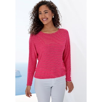 Shirt von Lascana mit Alloverdruck, jedes Teil ein Unikat. Gestreifte Einsätze an Ärmel- und Saumabschluss, am Saum zusätzlich mit Schleife zum Binden. Länge ca. 62 cm. Aus 100% Viskose.